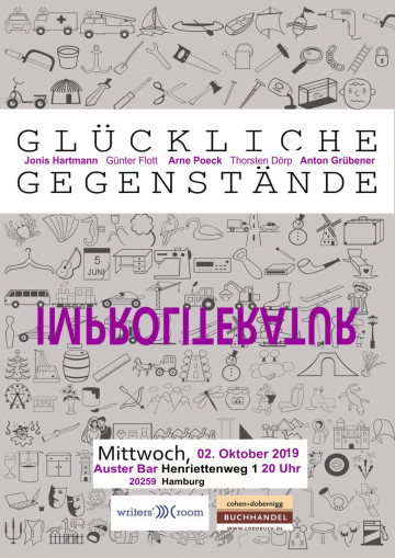 Mit dabei sind Jonis Hartmann, Günther Flott, Arne Poeck, Anton Grübener, Matthias Staehle und meine Wenigkeit. Es wird ein vergnüglicher Abend: wie soll es auch anders sein, wenn Menschen Sachen aufschreiben, von denen sie vorher nie geahnt hätten, dass sie sie jemals aufschreiben werden ...
